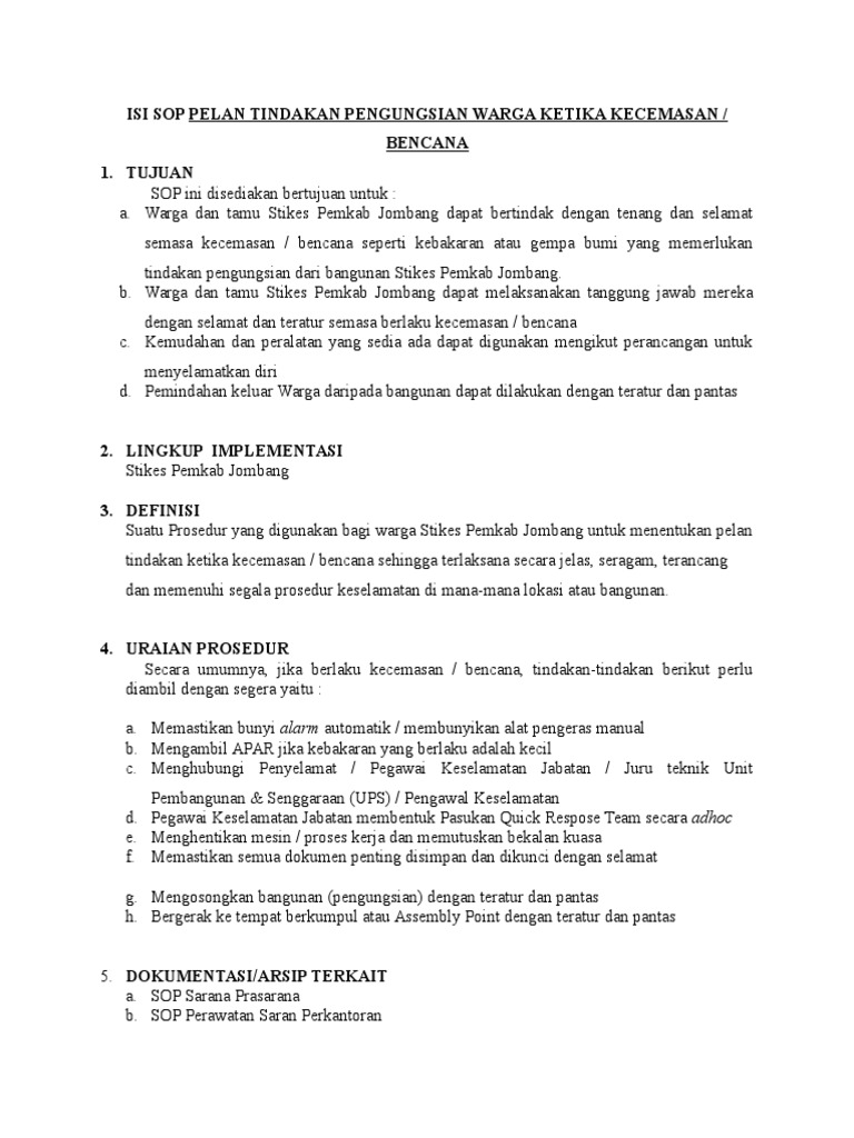 Standard Operating Procedure atau biasa disebut dengan SOP merupakan. PENGGUNAAN SKOP SOP SOP ini digunakan bagi menentukan pelan tindakan ketika kecemasan bencana dilaksanakan secara jelas seragam terancang dan memenuhi segala prosedur keselamatan di mana-mana lokasi atau bangunan PKDKlinik. Topik K3 lainnya yang bisa Anda pelajari adalah contoh komunikasi vertikal contoh buku laporan harian satpam.